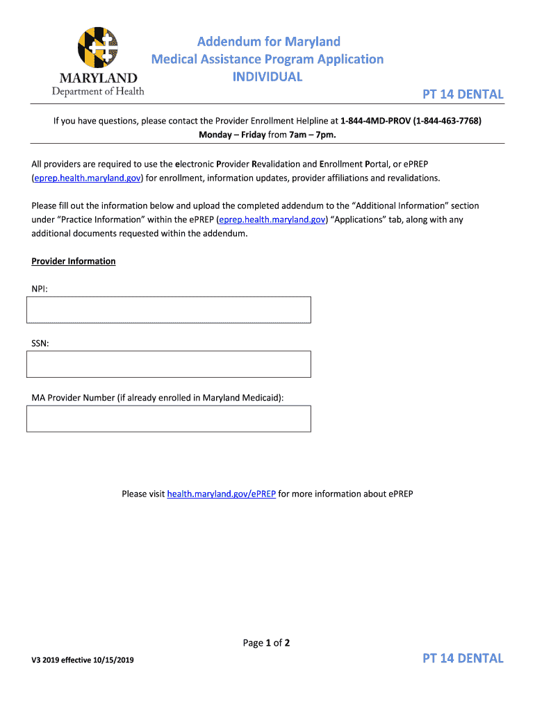 Addendum for Maryland Medical Assistance Program Application INDIVIDUAL PT 14 Dental you have questions, please contact the Provider Enrollment Helpline at 18444MDPROV (18444637768) Monday Friday