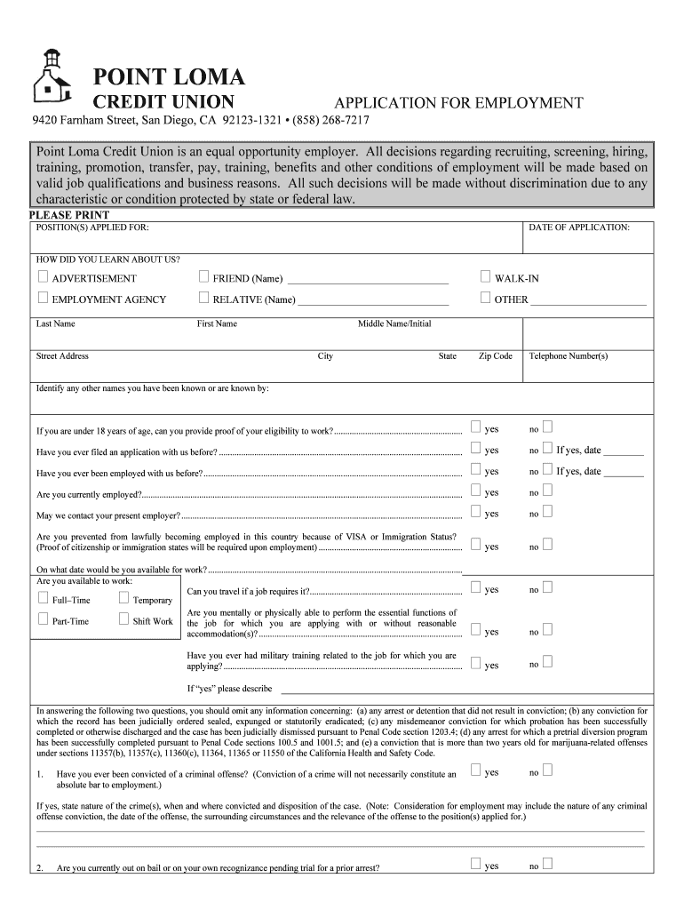 Get the free Point Loma Credit Union Employment Application