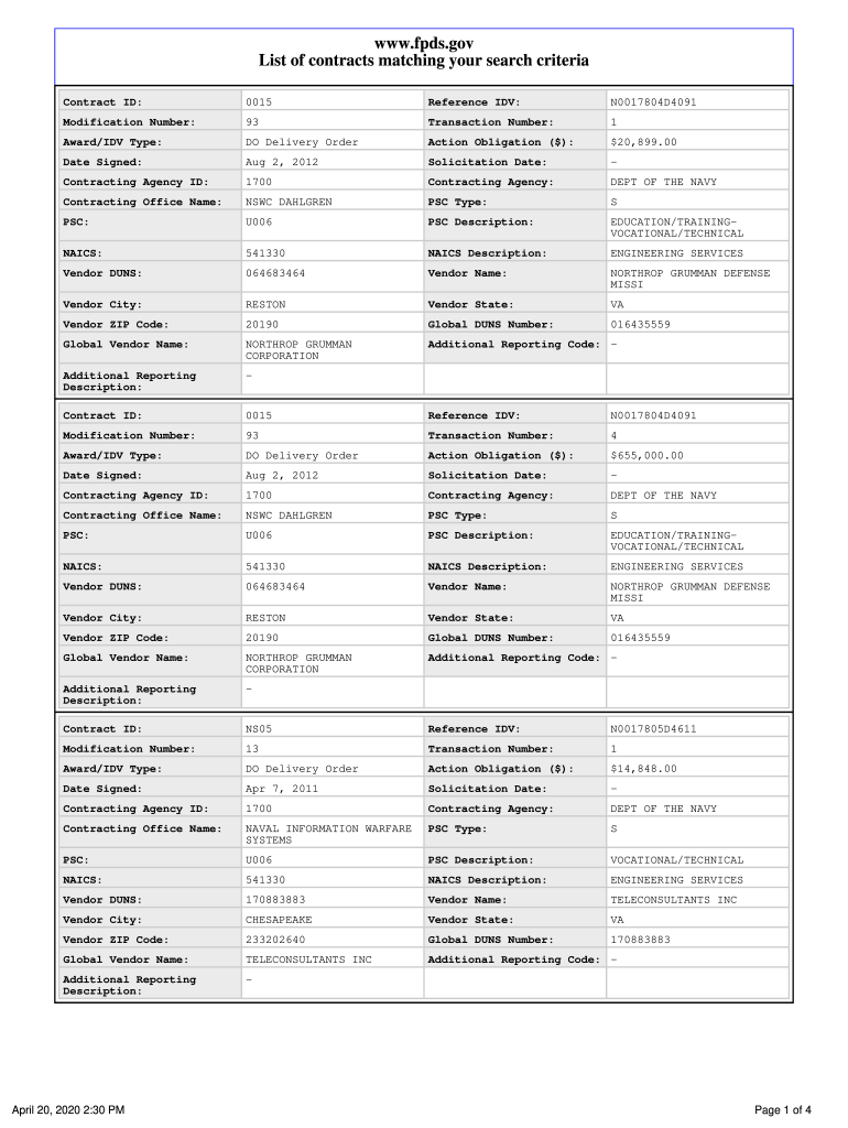 Contract ID:0015Reference ID:N0017804D4091Modification Number:93Transaction Number:1Award/ID Type:DO Delivery Operation Obligation ($):$20,899.00Date