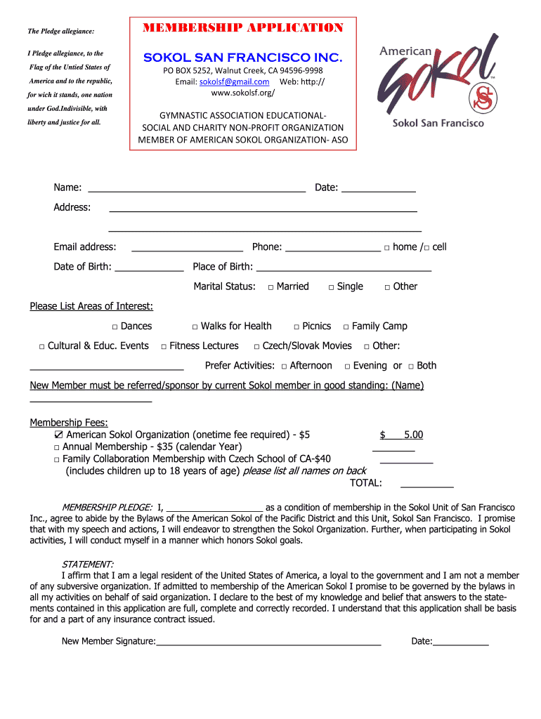 MEMBERSHIP APPLICATION SOON SAN FRANCISCO INC. The Pledge allegiance: I Pledge allegiance, to the Flag of the United States ofPOBOX5252,Walnut Creek,CA945969998 Email:tools Gmail.cobweb:h p:// www.sokolsf.org/
