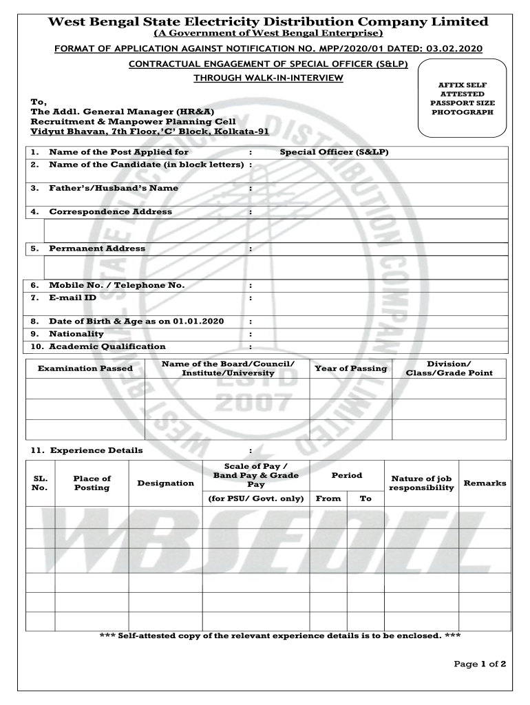 West Bengal State Electricity Distribution Company Limited (A Government of West Bengal Enterprise) FORMAT OF APPLICATION AGAINST NOTIFICATION NO. MPP/2020/01 DATED: 03.02.2020 CONTRACTUAL ENGAGEMENT