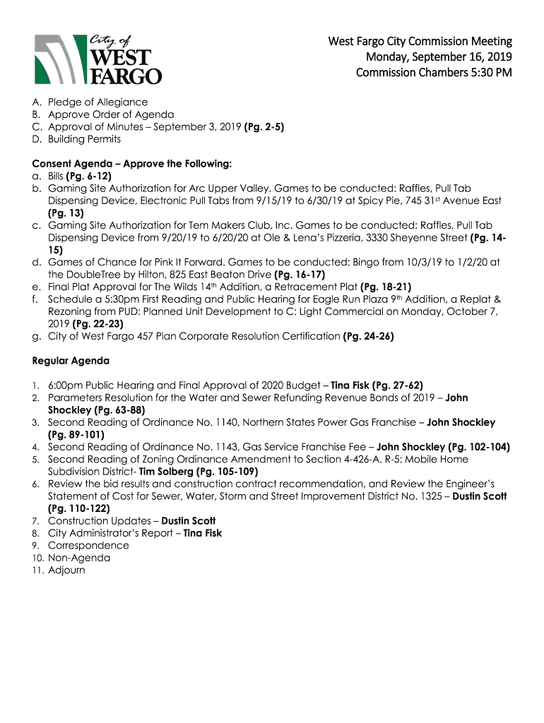 West Fargo City Commission Meeting Monday, September 16, 2019, Commission Chambers 5:30 PM A. B. C. D. Pledge of Allegiance Approve Order of Agenda Approval of Minutes September 3, 2019 (Pg. 25) Building