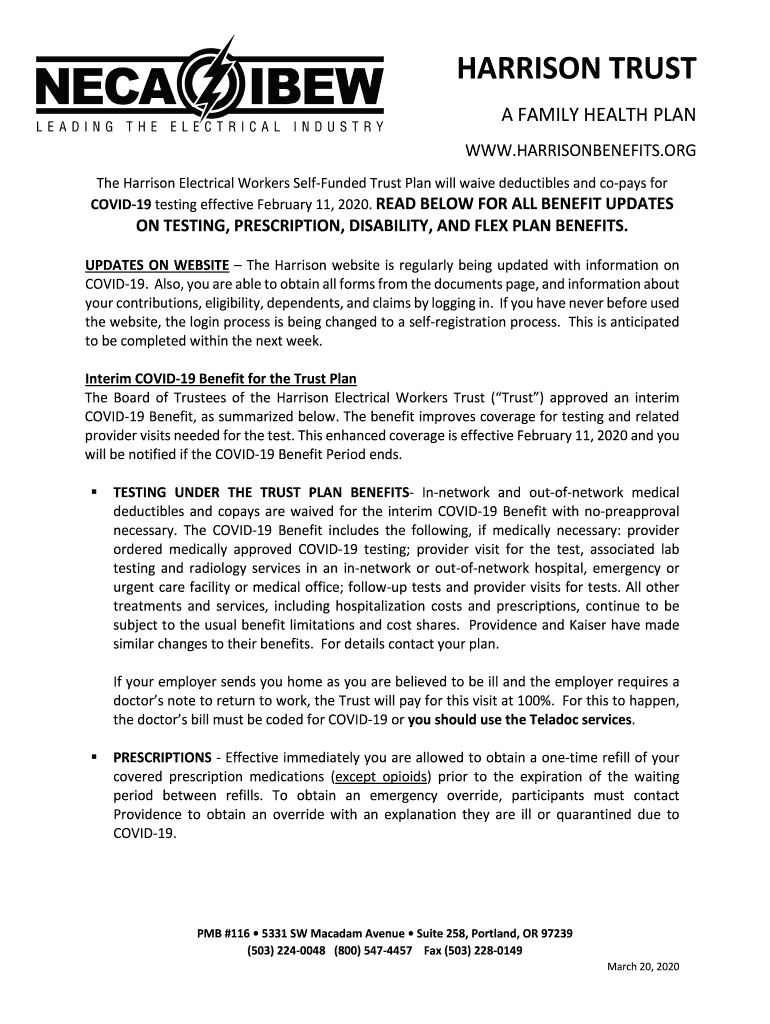 HARRISON Trusts A FAMILY HEALTH PLAN WWW.HARRISONBENEFITS.ORG The Harrison Electrical Workers Refunded Trust Plan will waive deductibles and copay for COVID-19 testing effective February 11, 2020.