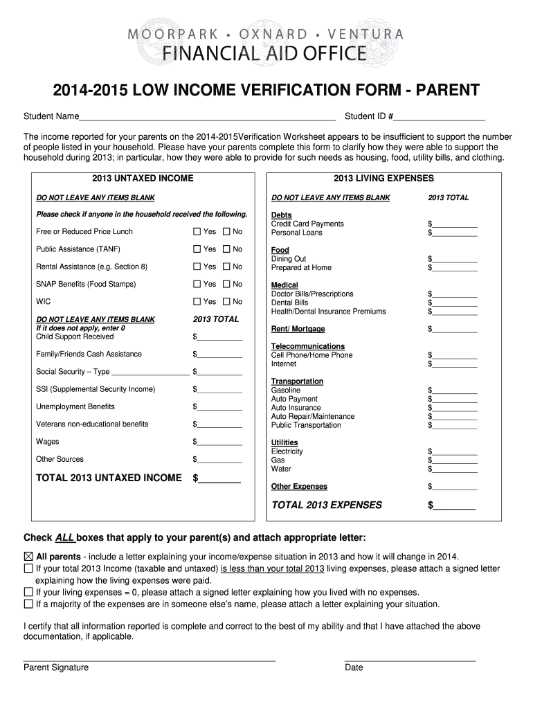 The 2014-2015 Low Income Verification Form is a financial aid application document used by parents to clarify income and expenses for their child's financial aid eligibility.