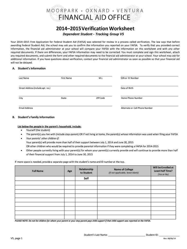 The 2014–2015 Verification Worksheet for Dependent Student serves a crucial role in validating the information provided by students on their Free Application for Federal Student Aid (FAFSA). This specific form ensures that students seeking financial aid have accurate data for their applications. It's essential for dependent students, as they are required to include their family’s financial details to qualify for federal student aid.