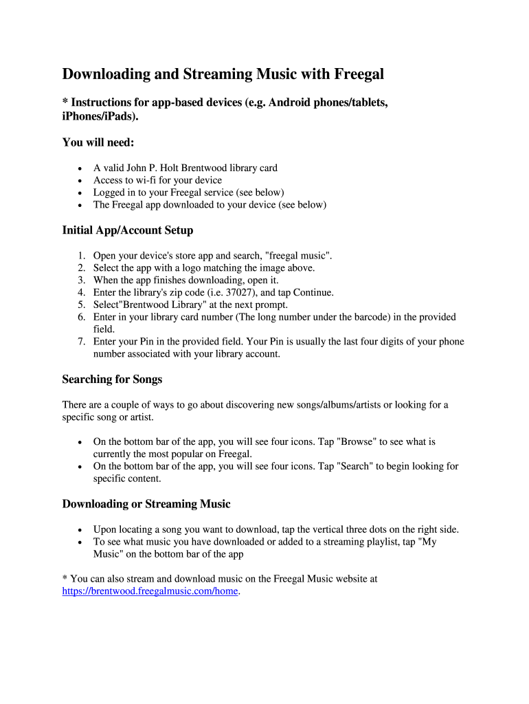 Downloading and Streaming Music with Free gal * Instructions for appeased devices (e.g. Android phones/tablets, iPhones/iPads). You will need: A valid John P. Holt Brentwood library card Access to