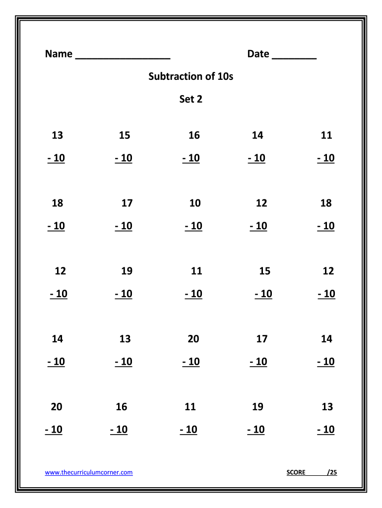 Name Date Subtraction of 10s Set 2 1315161411 10 10 10 10 101817101218 10 10 10 10 101219111512 10 10 10 10 101413201714 10 10 10 10 102016111913 10 10 10 10 10www.thecurriculumcorner.comSCORE/25