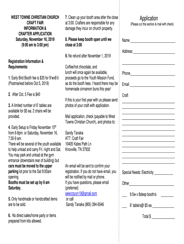 WEST TOWN CHRISTIAN CHURCH CRAFT FAIR INFORMATION & CRATER APPLICATION Saturday, November 16, 2019 (9:00 am to 3:00 pm)7. Clean up your booth area after the close at 3:00. Craters are responsible