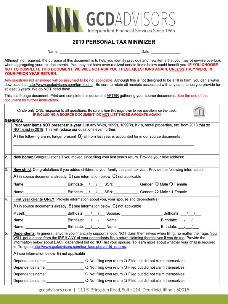 2019 PERSONAL TAX MINIMIZER Name: Date: Although not required, the purpose of this document is to help you identify previous and new items that you may otherwise overlook when aggregating your tax