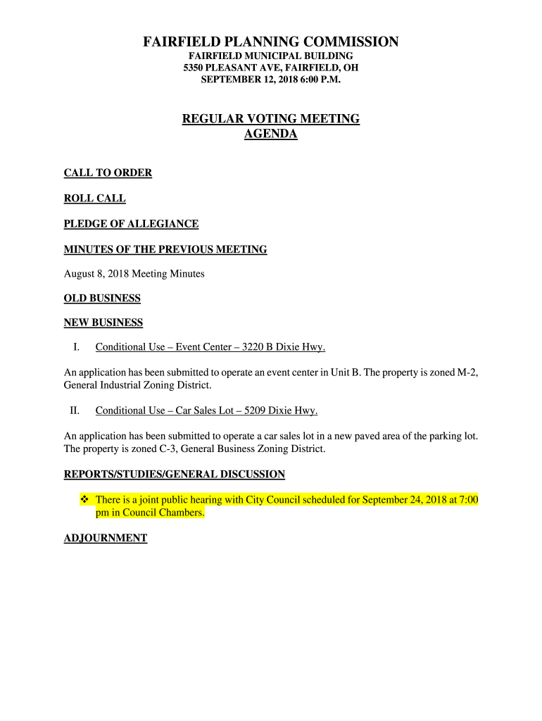FAIRFIELD PLANNING COMMISSION FAIRFIELD MUNICIPAL BUILDING 5350 PLEASANT AVE, FAIRFIELD, OH SEPTEMBER 12, 2018 6:00 P.M.REGULAR VOTING MEETING AGENDA CALL TO ORDER ROLL CALL PLEDGE OF ALLEGIANCE MINUTES