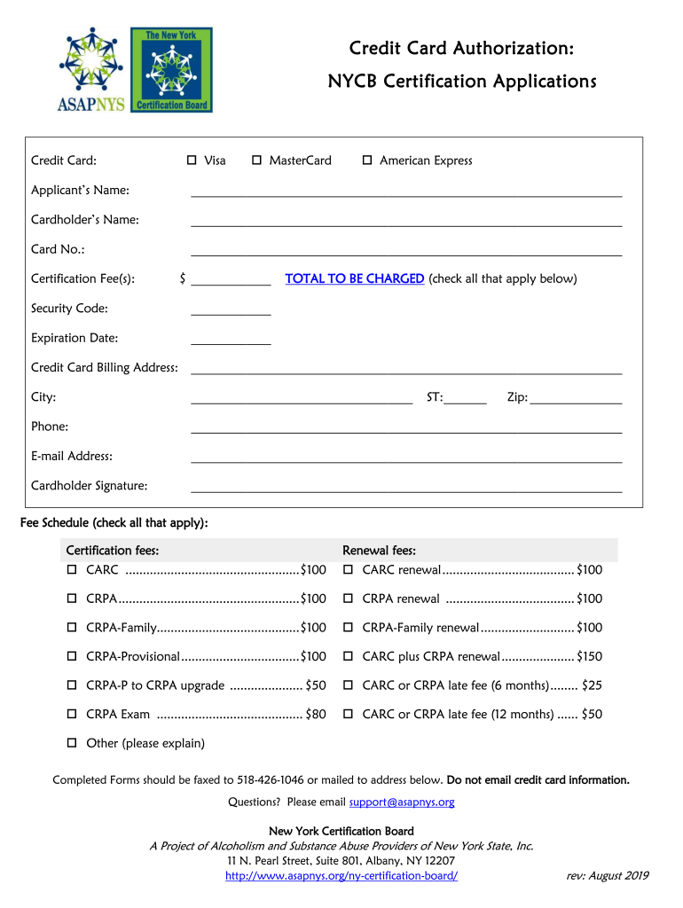 Credit Card Authorization: NYC Certification ApplicationsCredit Card: Visa MasterCard American ExpressApplicants Name: Cardholders Name: Card No.: Certification Fee(s):$ TOTAL TO BE CHARGED (check