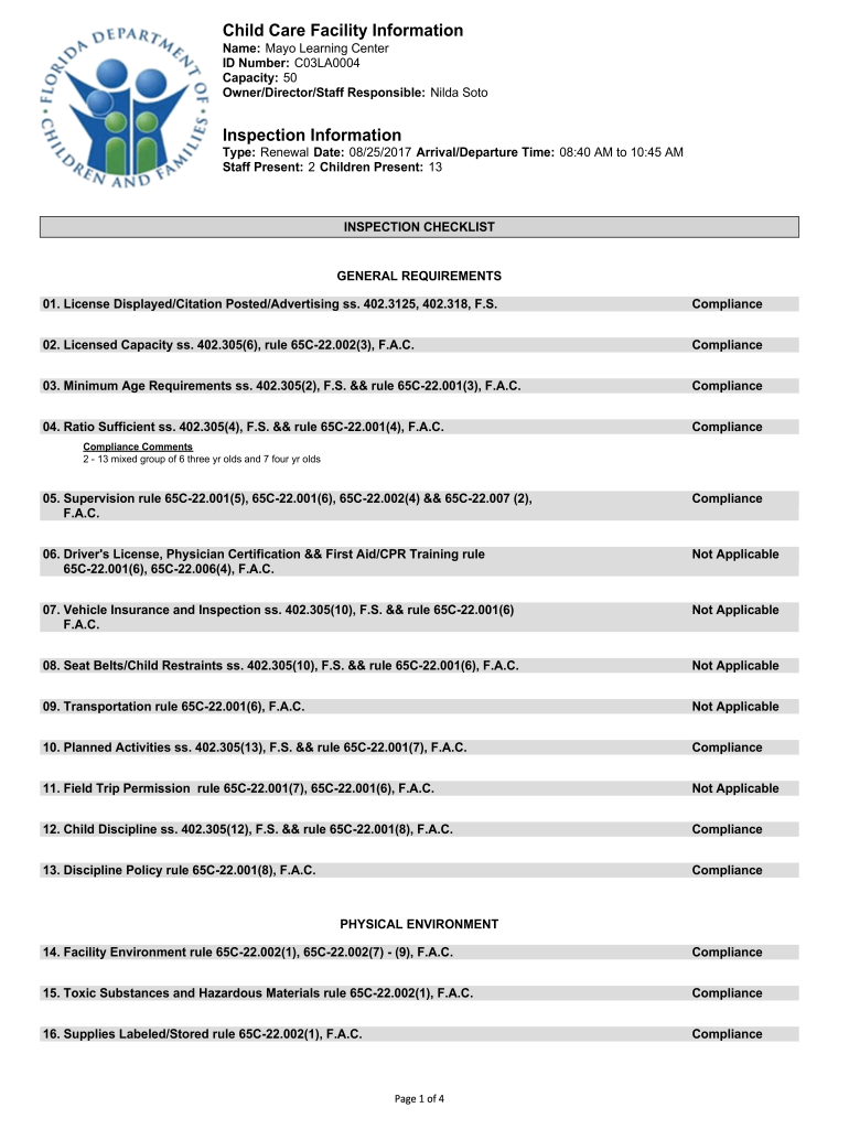 Owner/Director/Staff Responsible: Hilda SotoInspection Information