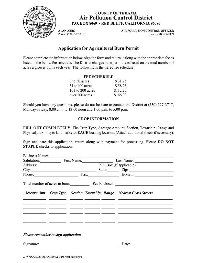 Get the free An Ag Burn Permit Application - Tehama County APCD
