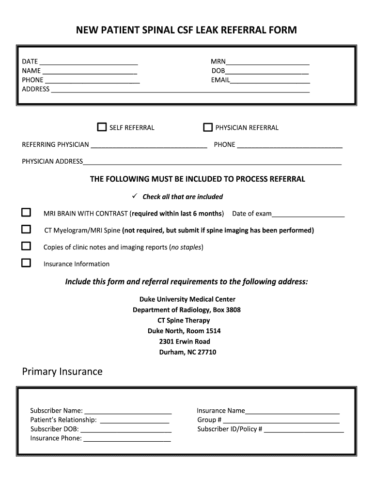 NEW PATIENT SPINAL CSF LEAK REFERRAL FORM DATE MAN NAME DOB PHONE EMAIL ADDRESS SELF REFERRALPHYSICIAN REFERRALREFERRING PHYSICIAN PHONE PHYSICIAN ADDRESS THE FOLLOWING MUST BE INCLUDED TO PROCESS