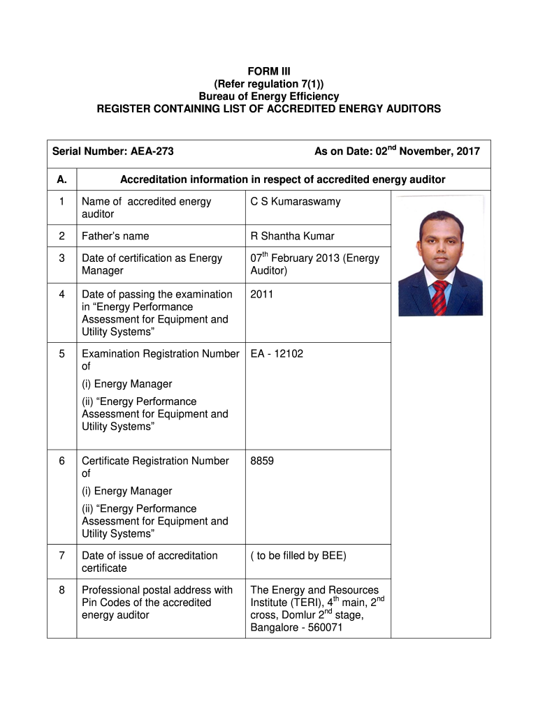 REGISTER CONTAINING LIST OF ACCREDITED ENERGY AUDITORS As on Date: 02nd November, 2017Serial Number: AEA273