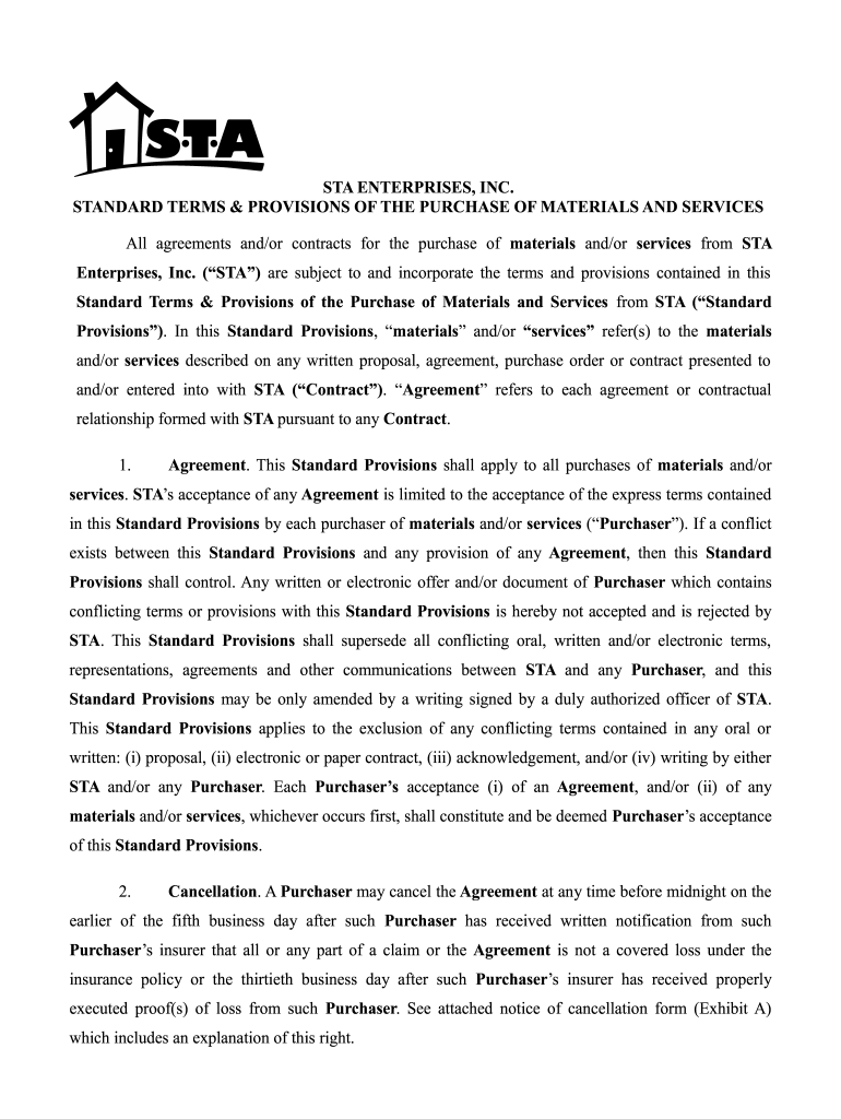 STA ENTERPRISES, INC. STANDARD TERMS & PROVISIONS OF THE PURCHASE OF MATERIALS AND SERVICES All agreements and/or contracts for the purchase of materials and/or services from STA Enterprises, Inc.