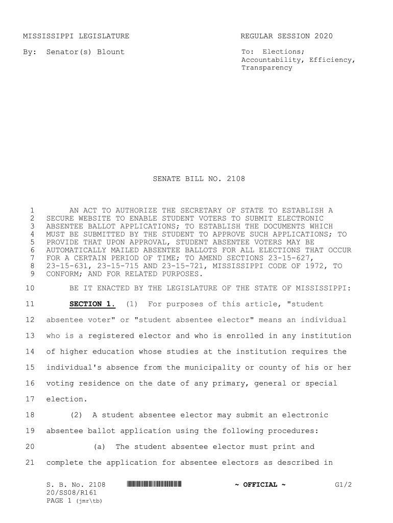 MISSISSIPPI LEGISLATUREREGULAR SESSION 2020By:To: Elections;