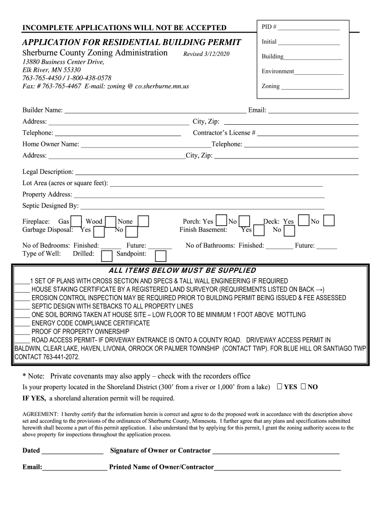 INCOMPLETE APPLICATIONS WILL NOT BE ACCEPTED PID # APPLICATION FOR RESIDENTIAL BUILDING PERMIT Hepburn County Zoning Administration Revised 3/12/2020Initial Building 13880 Business Center Drive, Elk