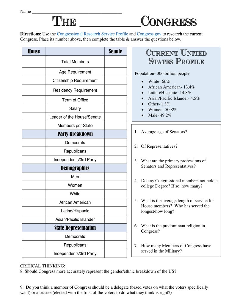 Name The Congress Directions: Use the Congressional Research Service Profile and Congress.gov to research the current Congress. Place its number above, then complete the table & answer the questions