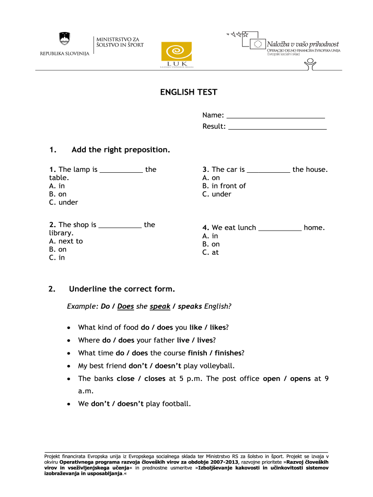 ENGLISH TEST Name: Result: 1. Add the right preposition.1. The lamp is the table. A. in B. on C. under3. The car is the house. A. on B. in front of C. under2. The shop is the library. A. next to B.