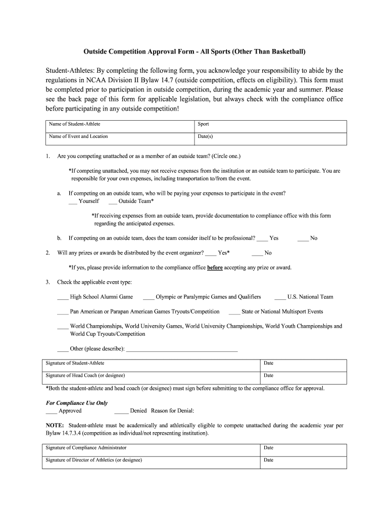 Outside Competition Approval Form All Sports (Other Than Basketball) StudentAthletes: By completing the following form, you acknowledge your responsibility to abide by the regulations in NCAA Division