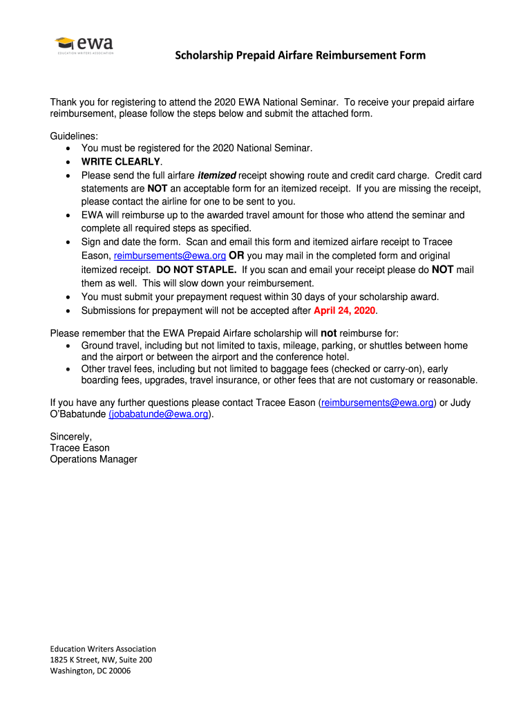 Scholarship Prepaid Airfare Reimbursement Firsthand you for registering to attend the 2020 ERA National Seminar. To receive your prepaid airfare reimbursement, please follow the steps below and submit