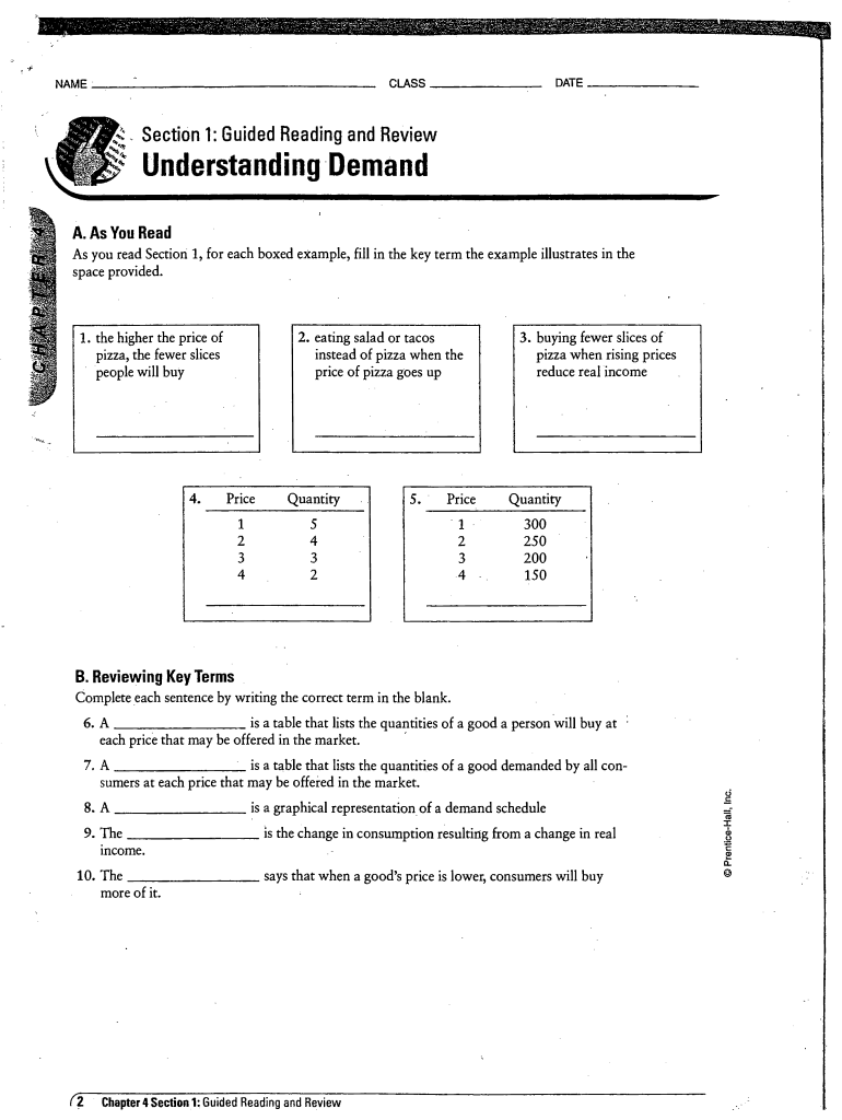 Names DATE Section 1: Guided Reading and ReviewUnderstanding Demand A. As You Read As you read Section 1, for each boxed example, fill in the key term the example illustrates in the space provided.2.