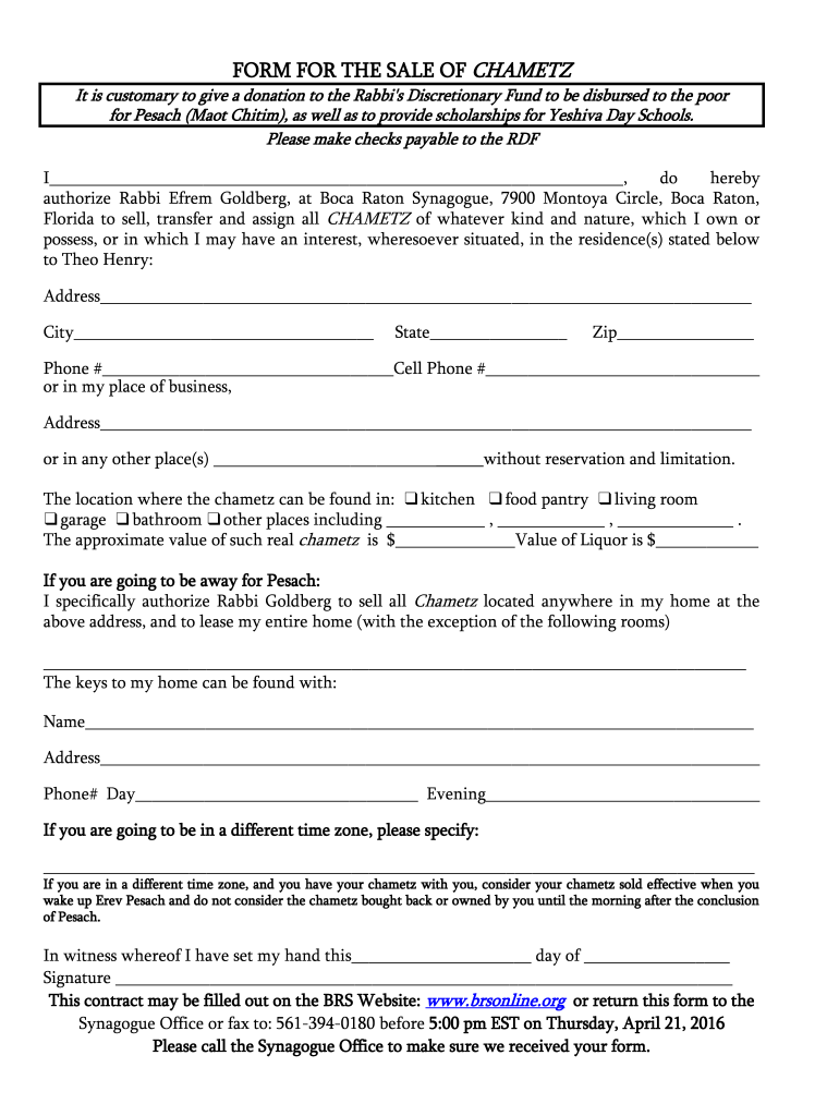 Get the free FORM FOR THE SALE OF CHAMETZ - Boca Raton Synagogue