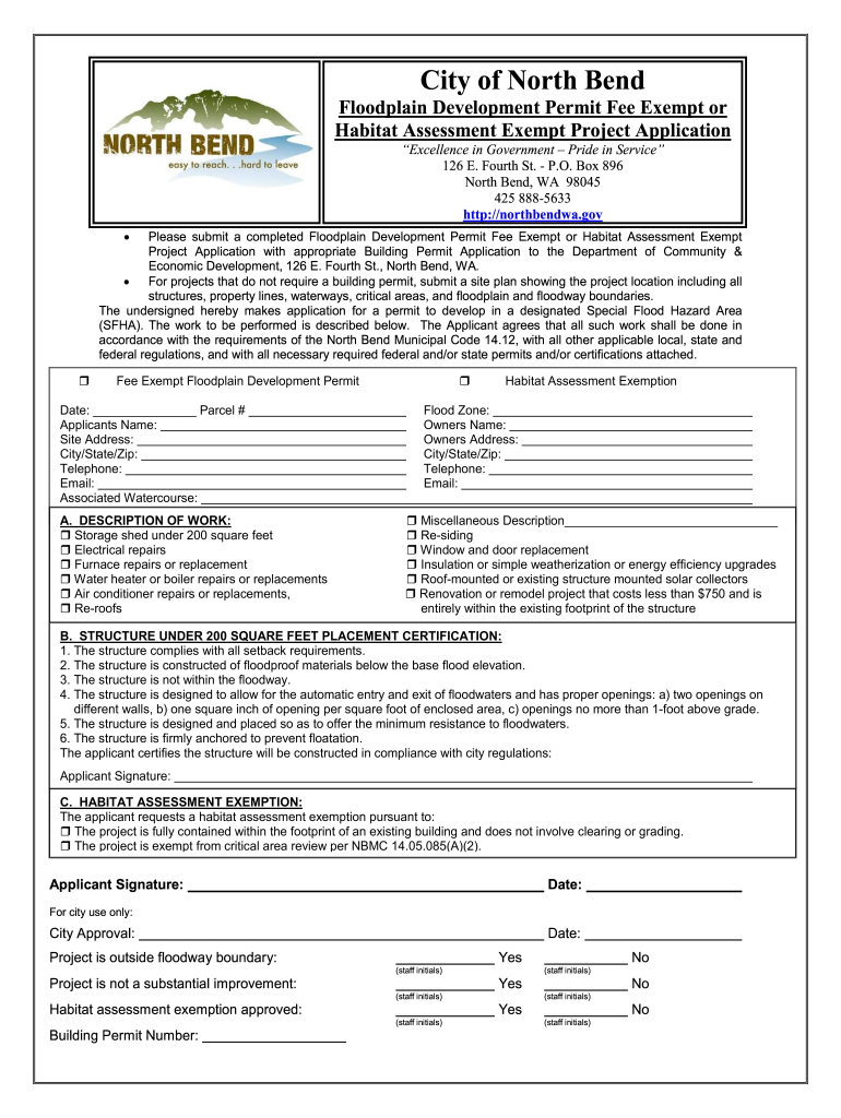 City of North BendFloodplain Development Permit Fee Exempt or Habitat Assessment Exempt Project Application Excellence in Government Pride in Service 126 E. Fourth St. P.O. Box 896 North Bend, WA