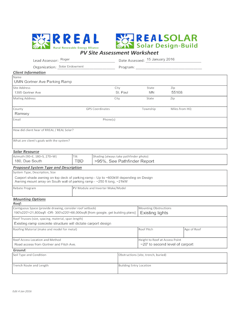 PV Site Assessment Worksheet Roger 15 January 2016 Lead Assessor: Date Assessed: Solar Endowment Organization: Program: Client InformationNameUMN Gartner Ave Parking Ramp Site Address 1395 Gartner