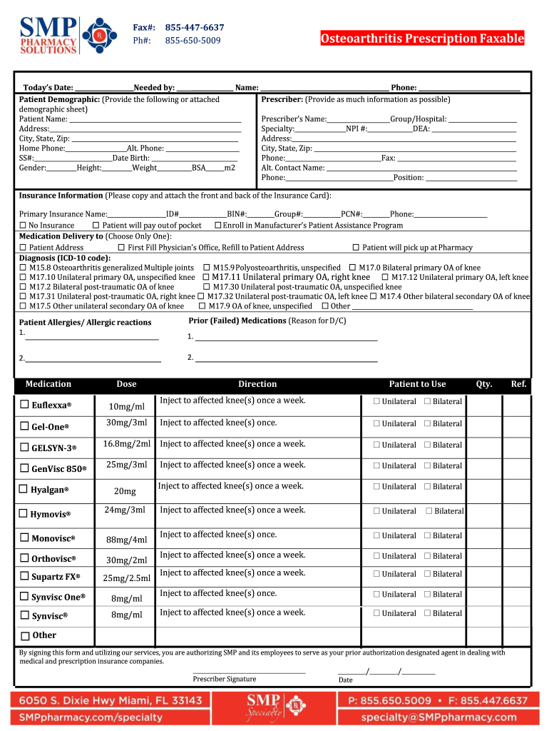 Fax#: pH#:8554476637 8556505009Osteoarthritis Prescription FaxableTodays Date: Needed by: Name: Phone: Prescriber: (Provide as much information as possible) Patient Demographic: (Provide the following