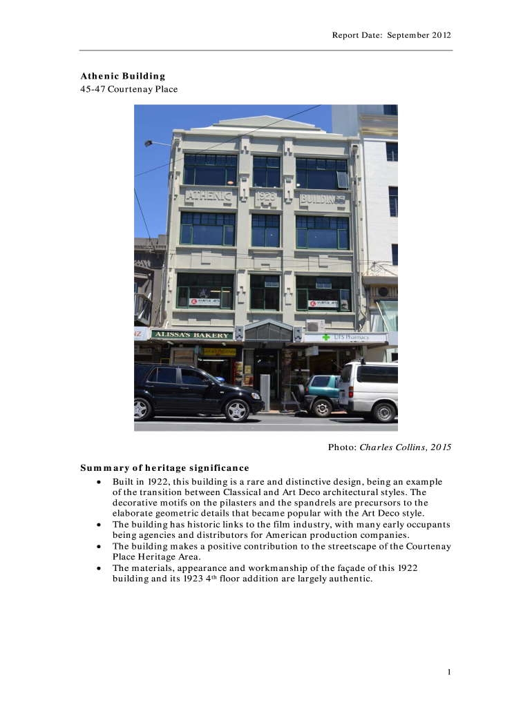 Report Date: September 2012Athenic Building 4547 Courtesy PlacePhoto: Charles Collins, 2015 Summary of heritage significance Built in 1922, this building is a rare and distinctive design, being an