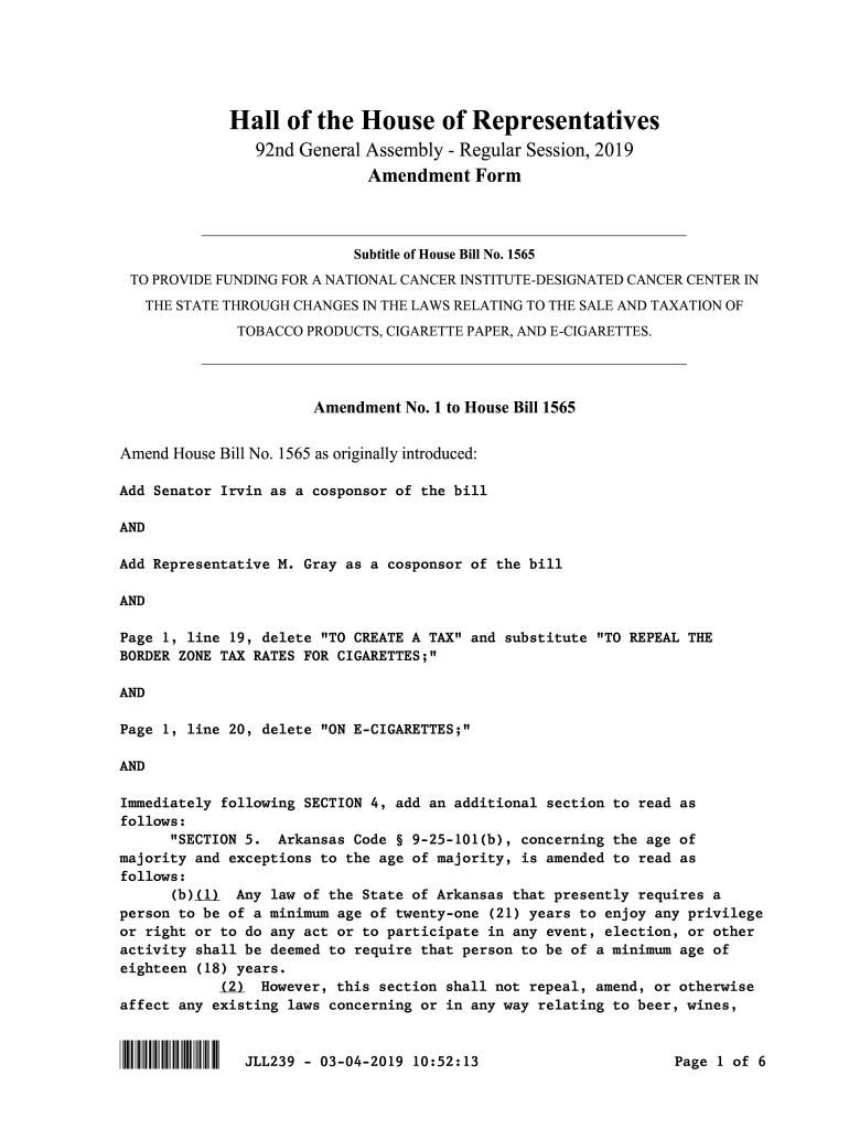 Hall of the House of Representatives 92nd General Assembly Regular Session, 2019 Amendment Form Subtitle of House Bill No. 1565 TO PROVIDE FUNDING FOR A NATIONAL CANCER INSTITUTEDESIGNATED CANCER