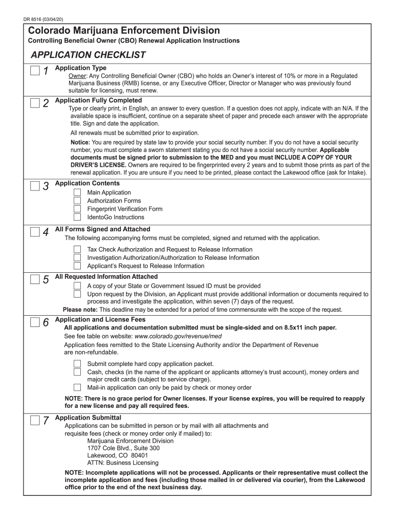 Renewal ApplicationMarijuana Enforcement Division DR 8516 (03/04/20)DR 8516 (03/04/20)Colorado Marijuana Enforcement DivisionControlling Beneficial Owner (CBO)