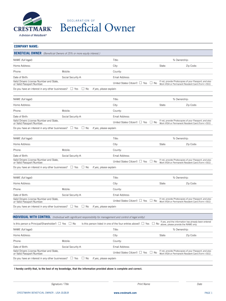 BENEFICIAL OWNER(Beneficial Owners of 25% or more equity interest.)NAME (full legal):Title:Home Address:City:Phone:Mobile:County:Date of Birth:Social