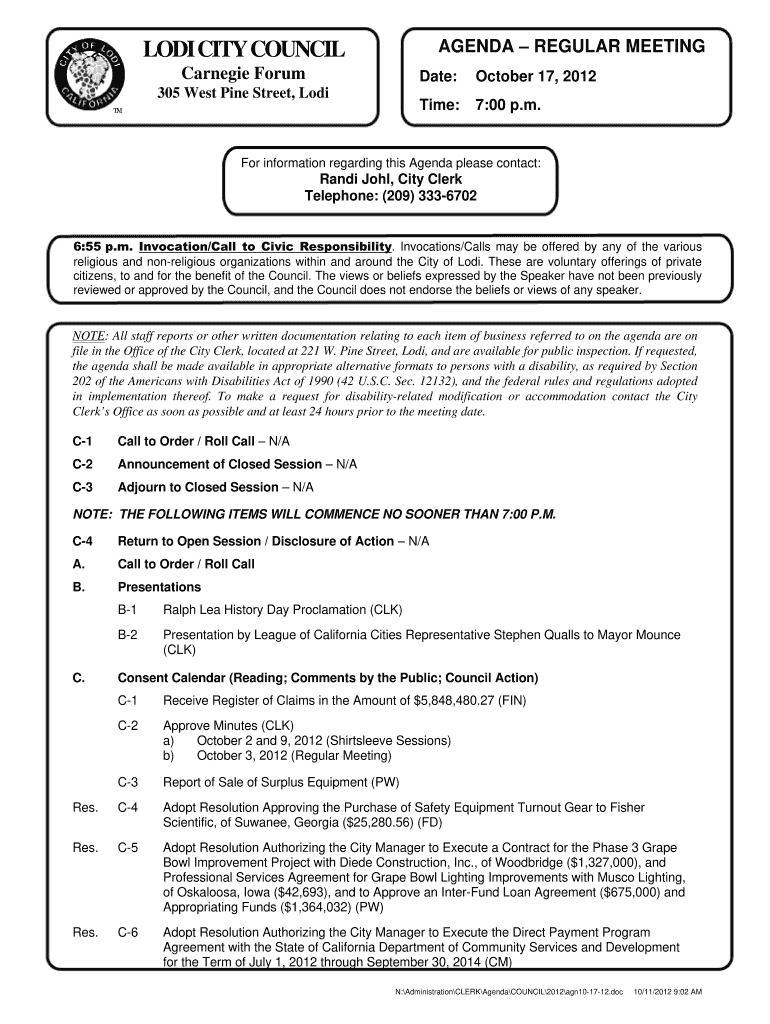 AGENDA REGULAR MEETINGLODI CITY COUNCIL Carnegie Forum 305 West Pine Street, Lodi TMD ate:October 17, 2012Time:7:00 p.m. For information regarding this Agenda please contact:Randi John, City Clerk