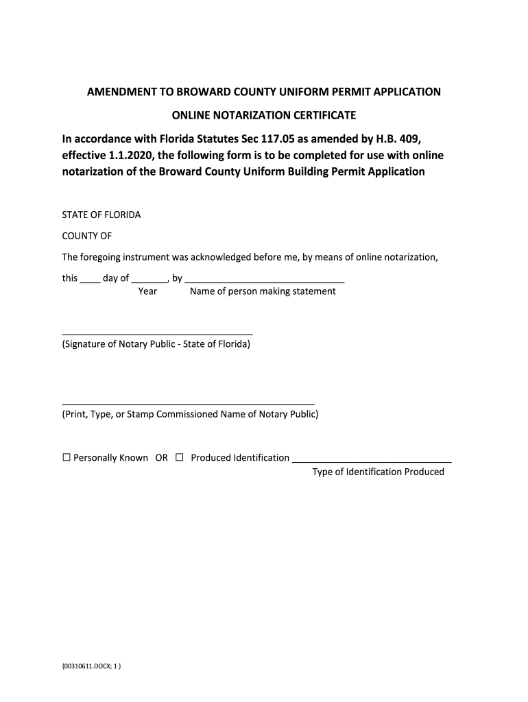 AMENDMENT TO BROWARD COUNTY UNIFORM PERMIT APPLICATION ONLINE NOTARIZATION CERTIFICATE In accordance with Florida Statutes Sec 117.05 as amended by H.B. 409, effective 1.1.2020, the following form