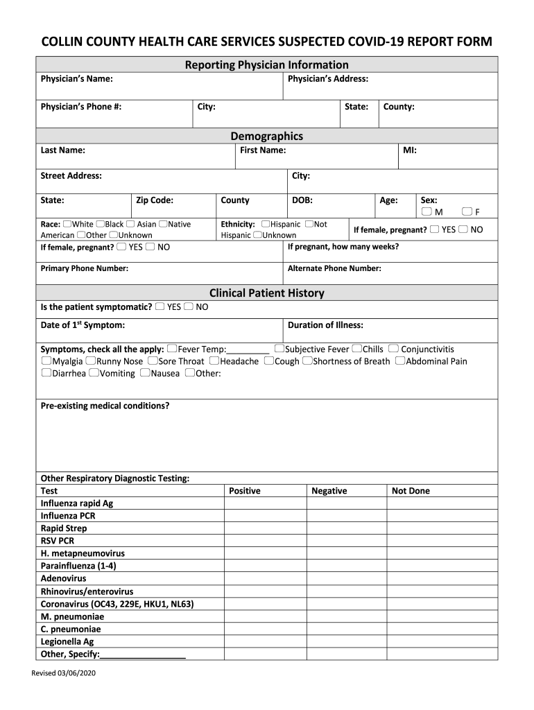 Get the free collin county health care services suspected covid-19 report form
