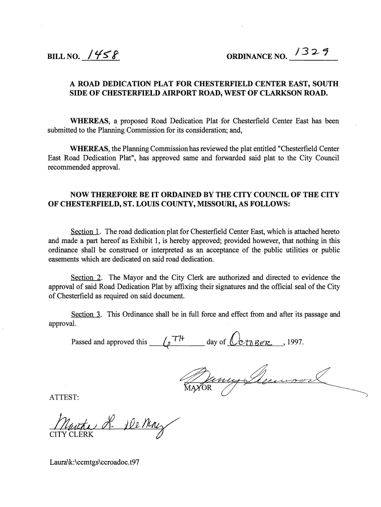 Get the free Ordinance 1329. 1458 1329 APPROVES A ROAD DEDICATION PLAT FOR CHESTERFIELD CENTER EA...