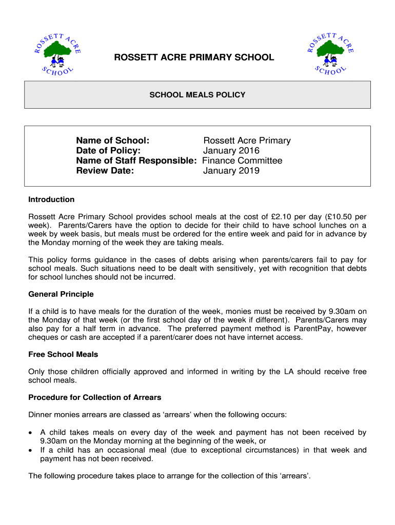 ROSSETTI ACRE PRIMARY SCHOOLSCHOOL MEALS Policymaker of School:
