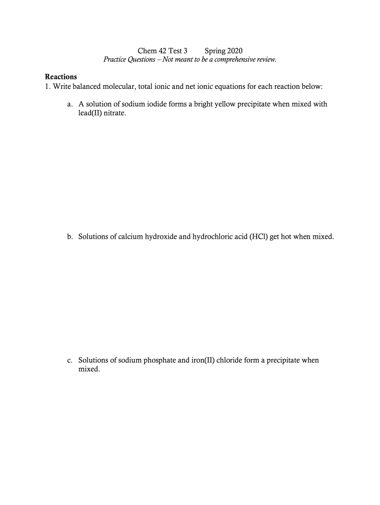Chem 42 Test 3 Spring 2020 Practice Questions Not meant to be a comprehensive review. Reactions 1. Write balanced molecular, total ionic and net ionic equations for each reaction below: a. A solution