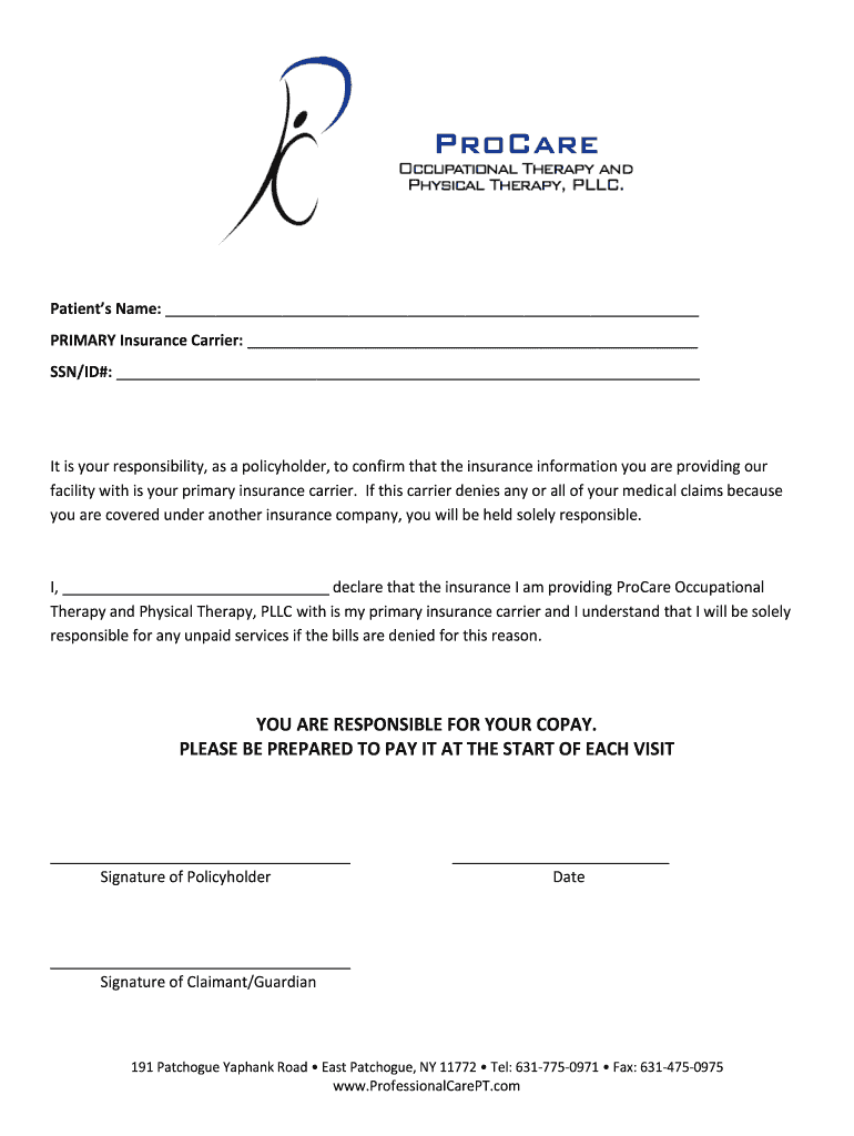 Patients Name: PRIMARY Insurance Carrier: SSN/ID#: It is your responsibility, as a policyholder, to confirm that the insurance information you are providing our facility with is your primary insurance