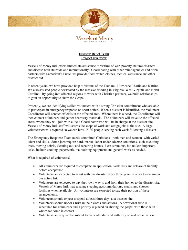 The Disaster Relief Team Application is essential for streamlining recruitment of volunteers in emergency response. It serves as a critical tool for Vessels of Mercy Intl., which plays a significant role in coordinating disaster relief efforts. Completing this application is your first step towards making a meaningful difference in your community and supporting national outreach during crises.