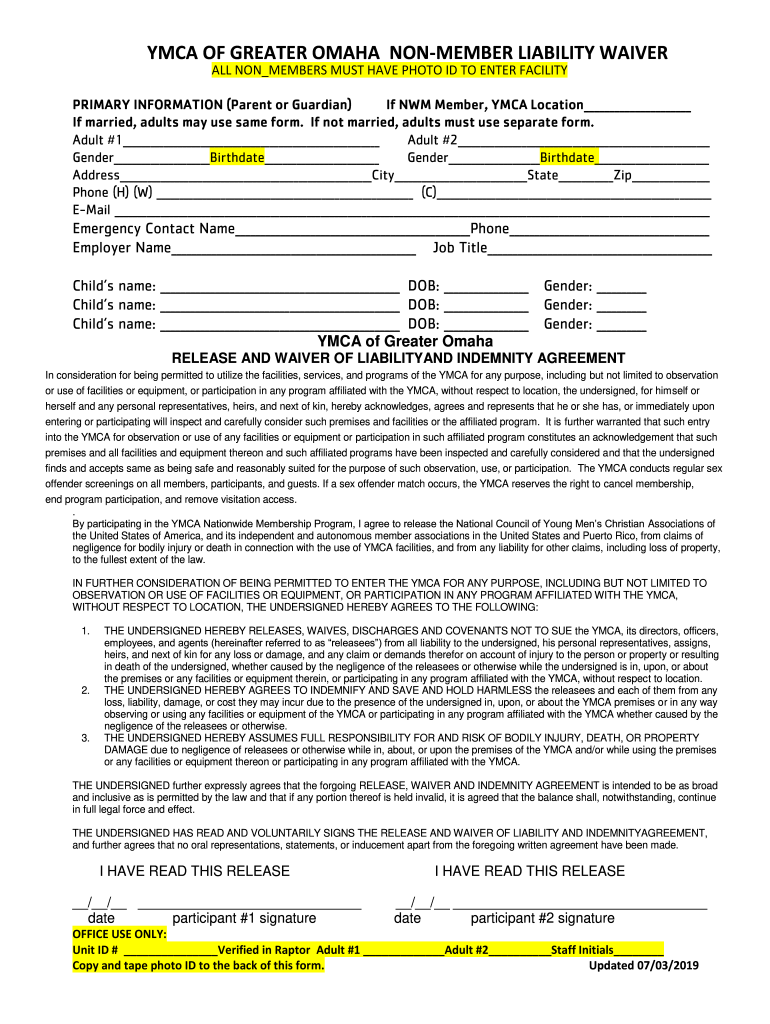 This document serves as a liability waiver for non-members of the YMCA of Greater Omaha, requiring personal information and acknowledgment of risks associated with utilizing the YMCA's facilities