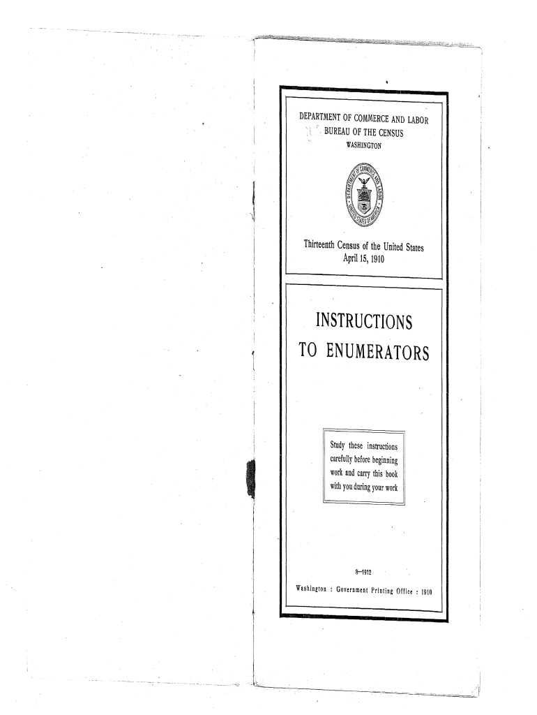 DEPARTMENT OF COMMERCE AND LABOR BUREAU OF THE CENSUS WASHINGTONThirteenth Census of the United States April 15, 1910INSTRUCTIOr 'LST ENUMERATORSStudy these instructions carefully before beginning