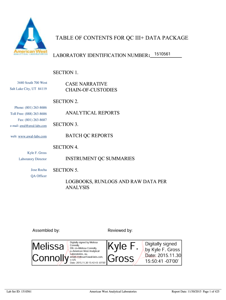 TABLE OF CONTENTS FOR QC III+ DATA PACKAGE LABORATORY IDENTIFICATION NUMBER: SECTION 1. CASE NARRATIVE CHAINOFCUSTODIESWest Salt Lake City, UT 8411SECTION 2. Phone: (801) 2638686ANALYTICAL REPORTSToll