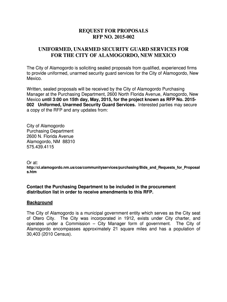 UNIFORMED, UNARMED SECURITY GUARD SERVICES FOR THE CITY OF ALAMOGORDO, NEW MEXICO