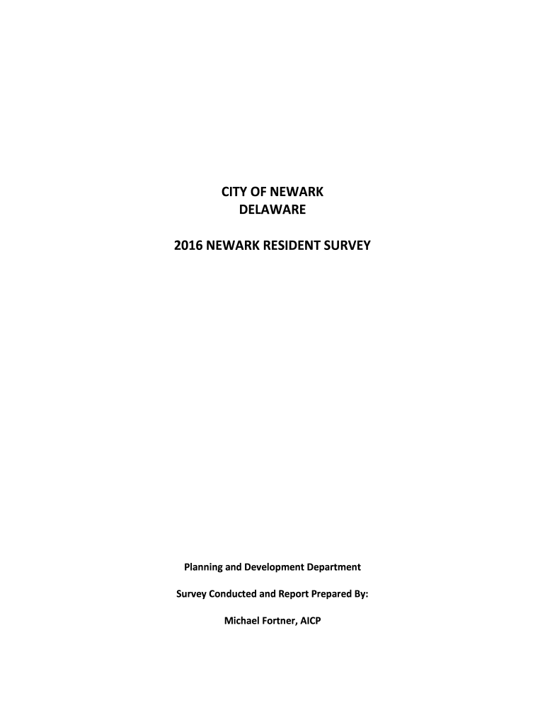 CITY OF NEWARK DELAWARE 2016 NEWARK RESIDENT SURVEYPlanning and Development Department Survey Conducted and Report Prepared By: Michael Former, ACCEPTABLE OF CONTENTS Table of ContentsiAcknowledgementsiiExecutive