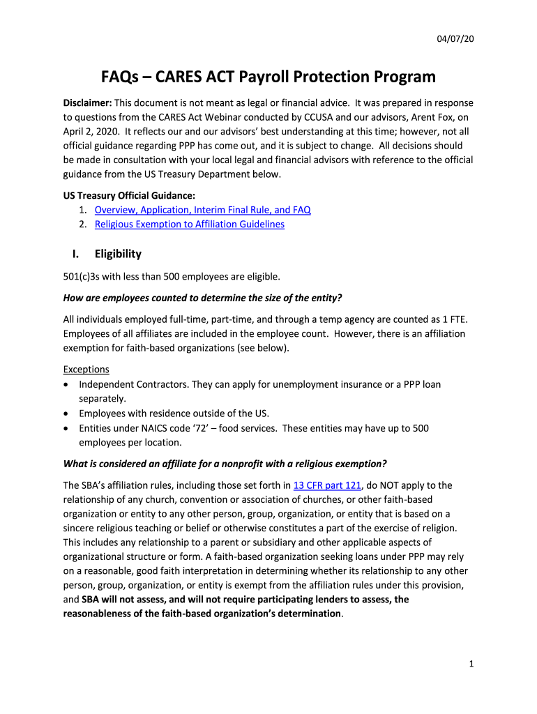 04/07/20FAQs CARES ACT Payroll Protection Program Disclaimer: This document is not meant as legal or financial advice. It was prepared in response to questions from the CARES Act Webinar conducted