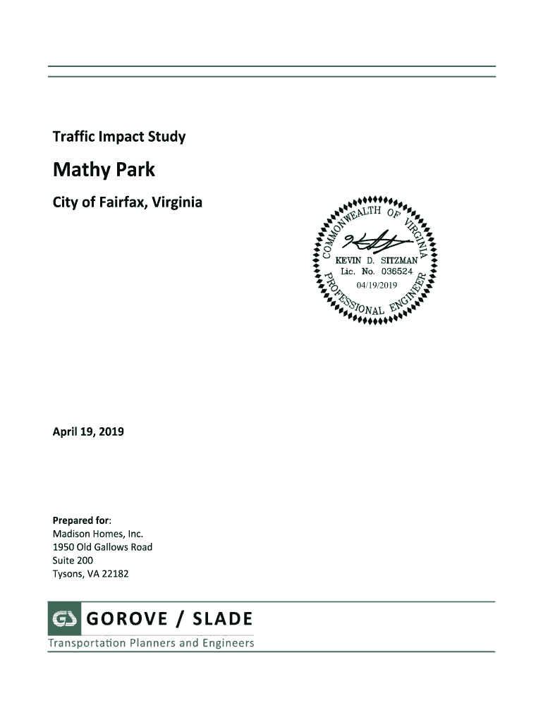TrafficImpactStudyMathyPark CityofFairfax,Virginia04/19/2019April19,2019Preparedfor: MadisonHomes, Inc. 1950OldGallowsRoad Suite200 Tyson's,VA22182TrafficImpactStudyMathyParkGorove/SladeAssociates